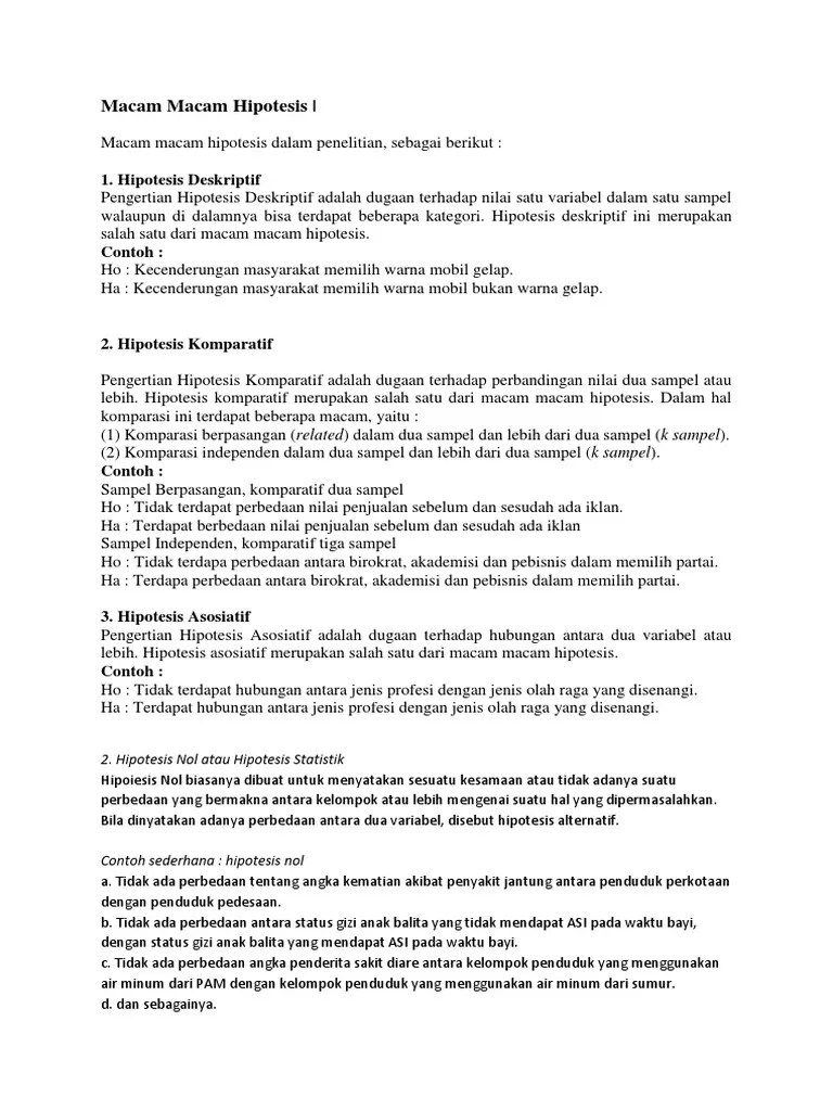 hipotesis mayor "ada hubungan antara keadaan sosial ekonomi (kse) orang tua dengan prestasi. Meskipun yang disebutkan di atas dianggap sebagai jenis hipotesis yang paling umum. • hipotesis nol adalah prediksi standar yang dirumuskan oleh sebuah penelitian ilmiah sementara hipotesis alternatif adalah apa pun selain h0. Cara merumuskan hipotesis ialah dengan tahapan sebagai berikut: contoh berikutnya adalah jenis hipotesis nihil yaitu yang sering disebut dengan hipotesis nol dimana tidak adanya ketarkaitan atau hubungan antara dua variabel.